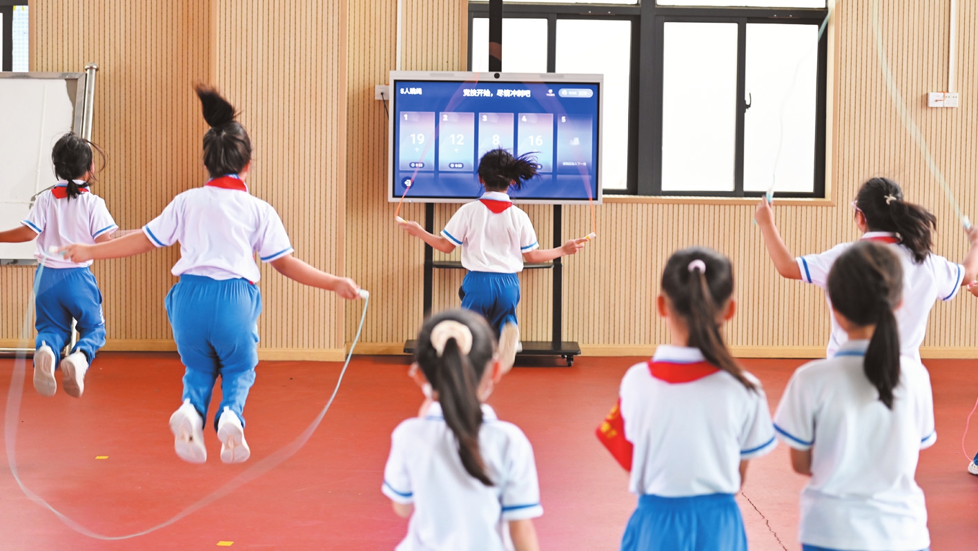 在海口市海景学校,学生们通过智慧体育设备进行竞技跳绳。海口日报记者 石中华 摄